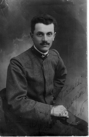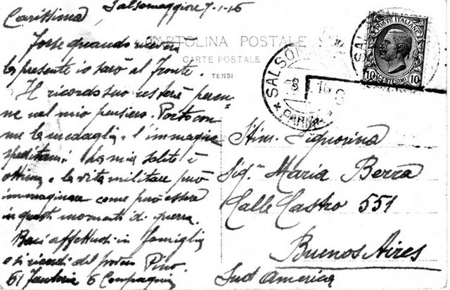 Carissima, forse quando riceverà la presente io sarò al fronte. Il ricordo suo resterà perenne nel mio pensiero. Porto con me la medaglia e l'immagine speditami. La mia salute è ottima e la vita militare può immaginare come può essere in questi momenti di guerra. Baci affettuosi in famiglia e si ricordi del povero Pino